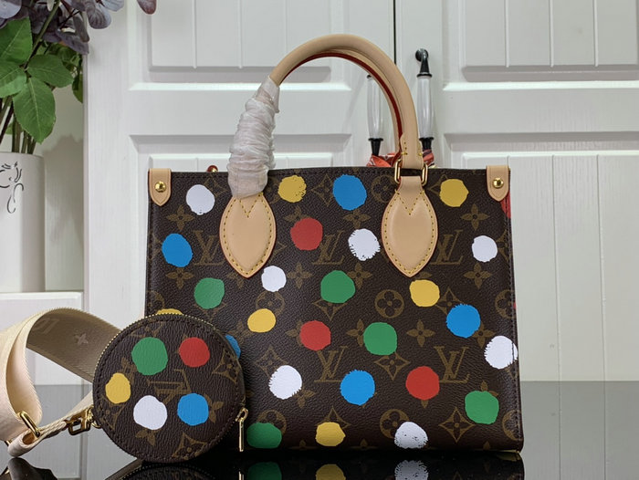 Monogram coated canvas with 3D Painted Dots print Natural cowhide-leather trim Printed cotton lining Gold-color hardware Size: W25 x H19 x D11 cm (1" = 2.54cm) It come with serial numbers, card, dust bag and care booklet.