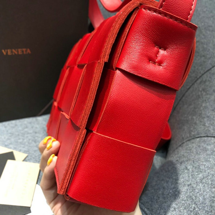 Bottega Veneta Cassette Bag in Maxi Intreccio Red 578004 - Made with wide double-face nappa strips in an orthogonal weave - Interior is identical to exterior; fitted with a zipped pocket - Magnetic closure - Strap folds inside bag to carry as a clutch Size: W23 x H15 x D5.5 cm (1" = 2.54CM) It Come with serial numbers, authenticity card, dust bag and care booklet.