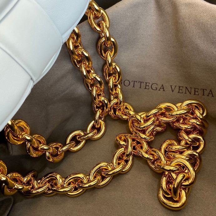 Bottega Veneta The Chain Cassette White B631421 - Cross-body bag in maxi Intrecciato Nappa leather - Padded double-face shiny Nappa strips in an orthogonal weave - Interior zipped pocket - Magnetic closure Size: W26 x H18 x D8 cm (1" = 2.54cm) It come with serial numbers, card, dust bag and care booklet.