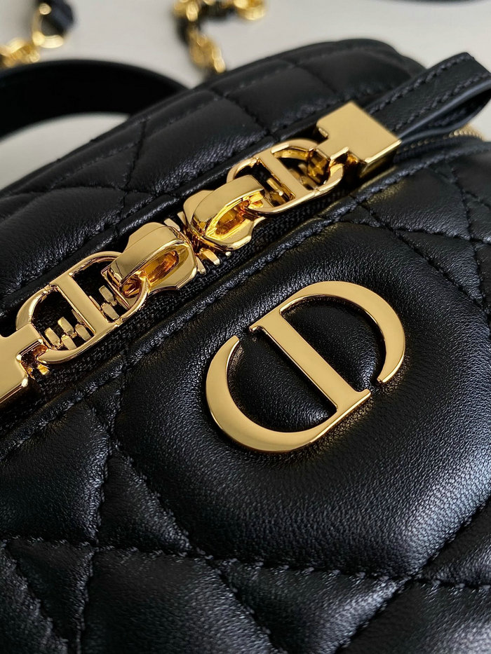 CD signature on the front Two-way zip closure with CD zip pulls Top handle One compartment with mirror Interior slip pocket Adjustable and removable chain in gold-finish metal and tonal enamel CD links with leather insert Size: W16.5 x H9.5 x D8 cm (1" = 2.54cm) It come with serial numbers, card, dust bag and care booklet.