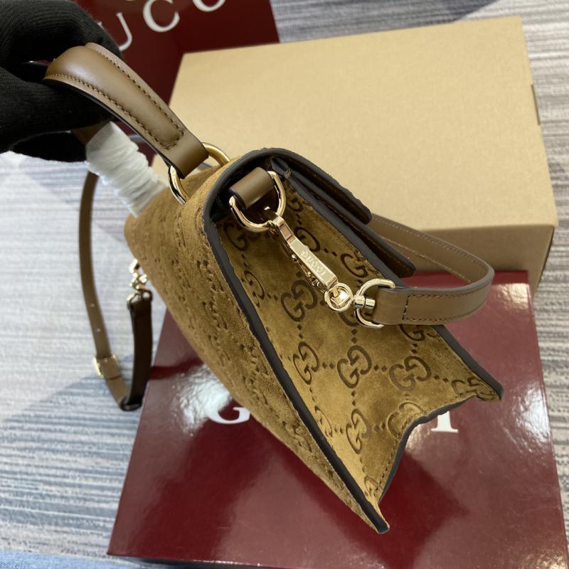 GG embossed suede Light gold-toned hardware Brown leather lining Inside: 2 main compartments with 1 open pocket under the flap Size: W22 x H16 x D8 cm (1" = 2.54cm) It come with serial numbers, dust bag and care booklet.