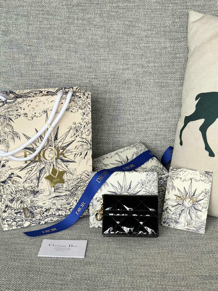 Patent Leather Detachable D.I.O.R. charm One gusseted compartment Two card slots Two patch pockets Size: W10.5 x H7.5 cm (1" = 2.54cm) It come with serial numbers, card, dust bag and care booklet.