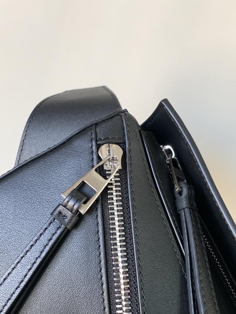 classic calfskin Shoulder or crossbody carry Adjustable shoulder strap featuring metal clasp closure with engraved LOEWE logo Calfskin zip pulls Mini Size: W18 x H12 x D7.5 cm (1" = 2.54cm) Price:$218 Small Size: W24 x H16 x D10.5 cm (1" = 2.54cm) Price: $243 It come with serial numbers, dust bag and care booklet.