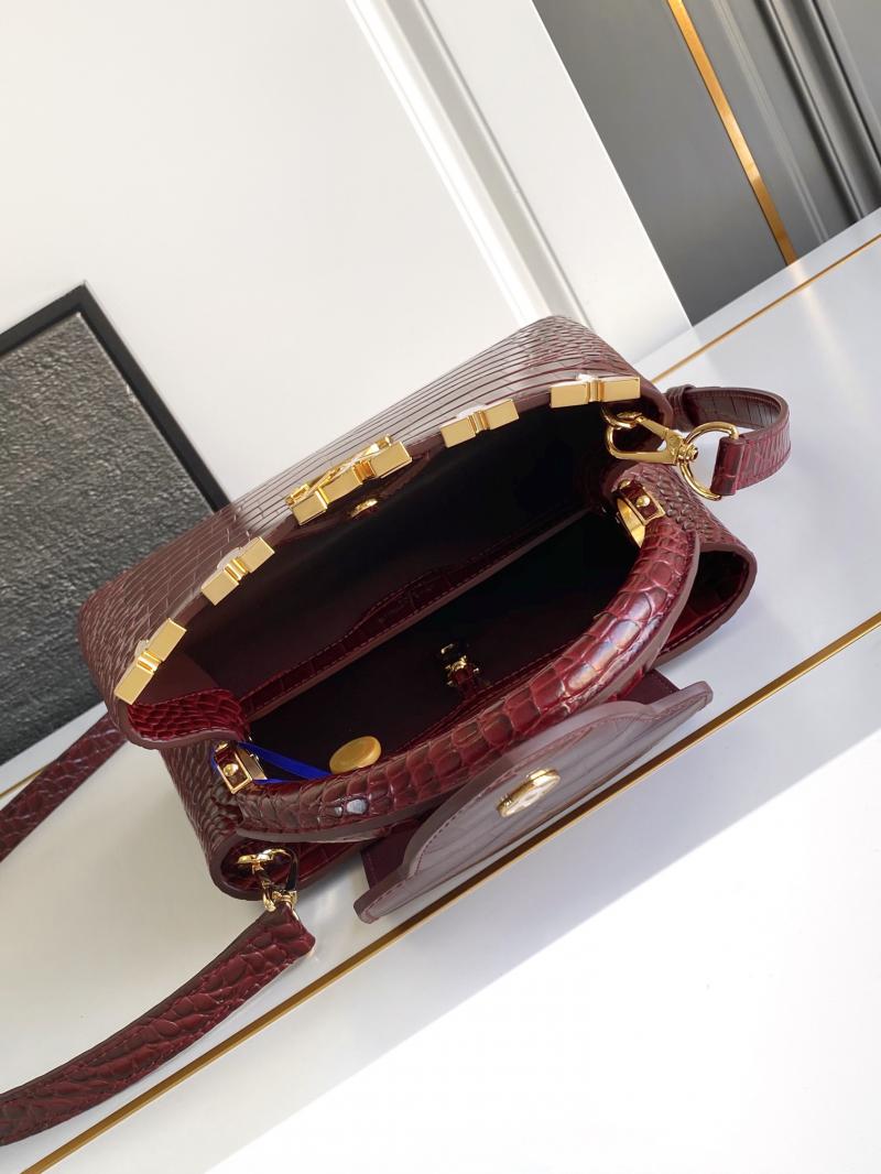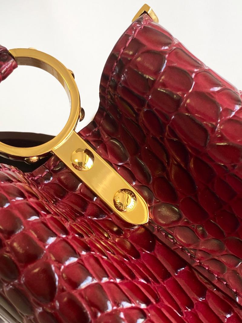 Calfskin Goatskin lining Gold-color hardware Snap hook to secure belongings Double carry style: flap inside or outside Compartmented interior with zipped pocket 4 protective metal bottom studs Strap: Removable, adjustable Mini Size: W21 x H14 x D8 cm Price: $335 BB Size: W27 x H20 x D10 cm Price: $385 It come with serial numbers, dust bag and care booklet.