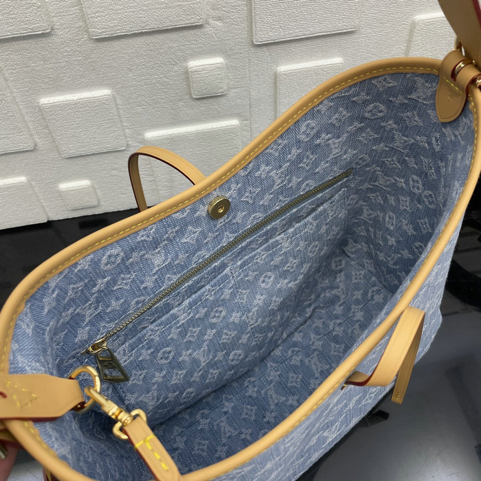 Sky Blue Denim Monogram Denim 100% GOTS-certified cotton Cowhide-leather trim 100% GOTS-certified cotton lining Gold-color hardware 2 inside small flat pockets Inside zipped pocket Leather lace and magnet closure Fits: 2 x smartphone, iPad Mini, compact wallet and other belongings Strap: Removable, adjustable Size: W29 x H24 x D12 cm (1" = 2.54cm) It come with serial numbers, card, dust bag and care booklet.