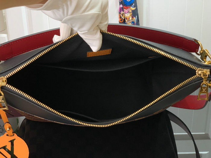 Louis Vuitton Damier Ebene Maida N40369 - Damier Ebene coated canvas and smooth calfskin leather - Smooth cowhide-leather trim - Microfiber lining - Gold-color hardware - 2 metallic zipped pullers as closure system - 2 inside flat pockets - 2 front flat pockets - LV charm - Strap: Removable, adjustable Size: W32 x H29 x D17 cm (1" = 2.54cm) It come with serial numbers, card, dust bag and care booklet.