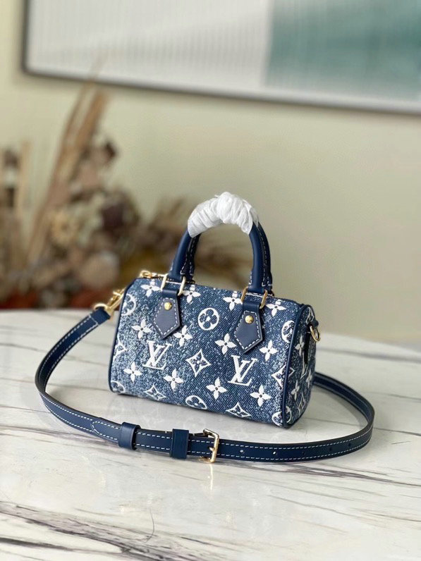 Louis Vuitton Denim Nano Speedy Blue M81213 Monogram jacquard denim Cowhide-leather trim Monogram jacquard-denim lining Gold-color hardware Zip closure Strap : Removable, adjustable Size: W16 x H10 x D7.5 cm (1" = 2.54cm) It come with serial numbers, card, dust bag and care booklet.