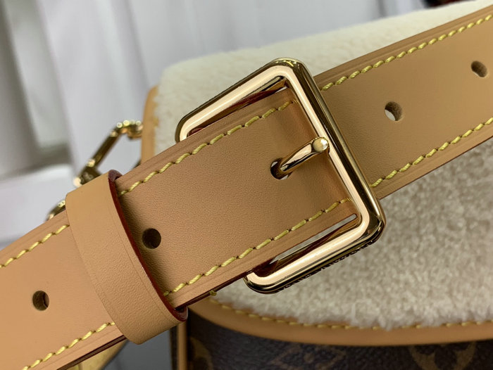 Monogram coated canvas and shearling (Merino wool from Spain) Natural cowhide-leather and shearling trim Textile lining in Beige Gold-color hardware Outside flat pocket Inside zipped pocket Flap with magnetic buckle Strap: Removable, not adjustable Size: W24 x H15 x D9 cm (1" = 2.54cm) It come with serial numbers, card, dust bag and care booklet.