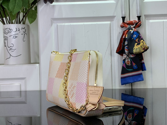 Peach Pink Damier coated canvas Natural cowhide-leather trim Textile lining Gold-color hardware Zip closure Large compartment Inside canvas zipped pocket 2 inside flat pockets 2 card slots Strap: Removable, non-adjustable Size: W23.5 x H13.5 x D4 cm (1" = 2.54cm) It come with serial numbers, card, dust bag and care booklet.