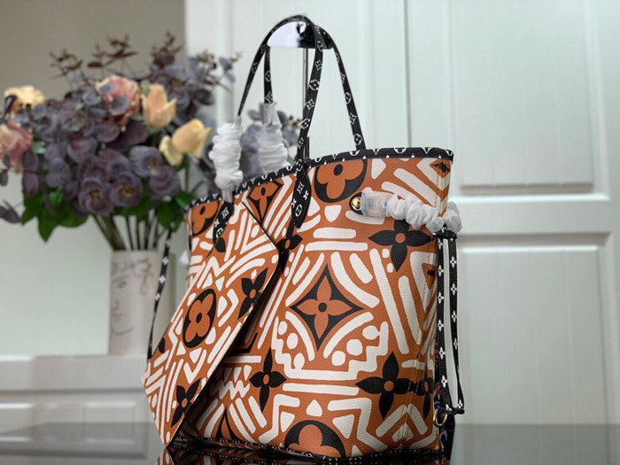 LV Crafty Neverfull MM M56584 - Caramel and Cream - Monogram Giant coated canvas - Cowhide-leather trim - Textile lining - Gold-color hardware - Leather side laces - Snap hook closing to secure belongings - Large zipped inside pocket - Removable printed zipped pouch - D-ring - Handle: Double Size: W31 x H28 x D14 cm (1" = 2.54cm) It come with serial numbers, card, dust bag and care booklet.