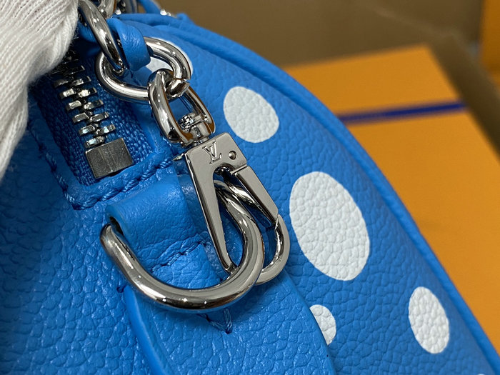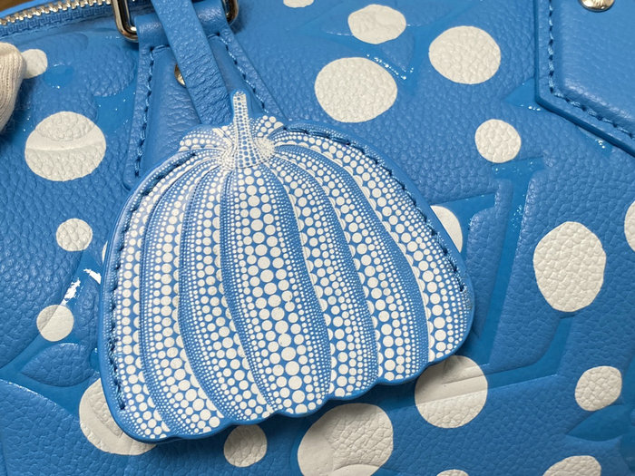 Blue and White Embossed grained Monogram Empreinte cowhide leather with Infinity Dots print Microfiber lining Silver-color hardware Inside LVxYK signature Double zipped closure with padlock Size: W20.5 x H13.5 x D12 cm (1" = 2.54CM) It come with serial numbers, card, dust bag and care booklet.