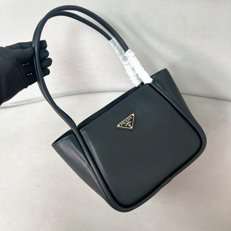 Leather handles Metal hardware Enameled metal triangle logo on the front Magnetic closure Logo-print nylon interior with three compartments Size: W25 x H18.5 x D12.5 cm (1" = 2.54cm) It come with serial numbers, dust bag and care booklet.