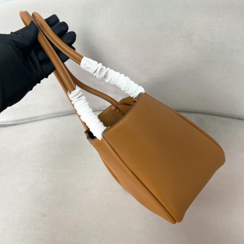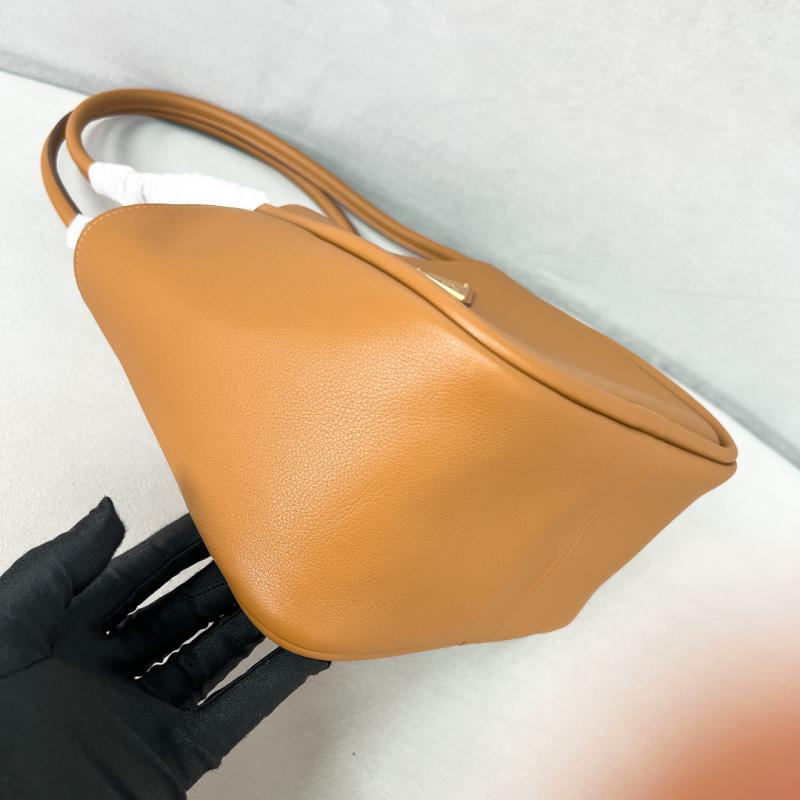 Leather handles Metal hardware Enameled metal triangle logo on the front Magnetic closure Logo-print nylon interior with three compartments Size: W25 x H18.5 x D12.5 cm (1" = 2.54cm) It come with serial numbers, dust bag and care booklet.