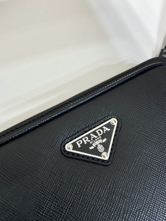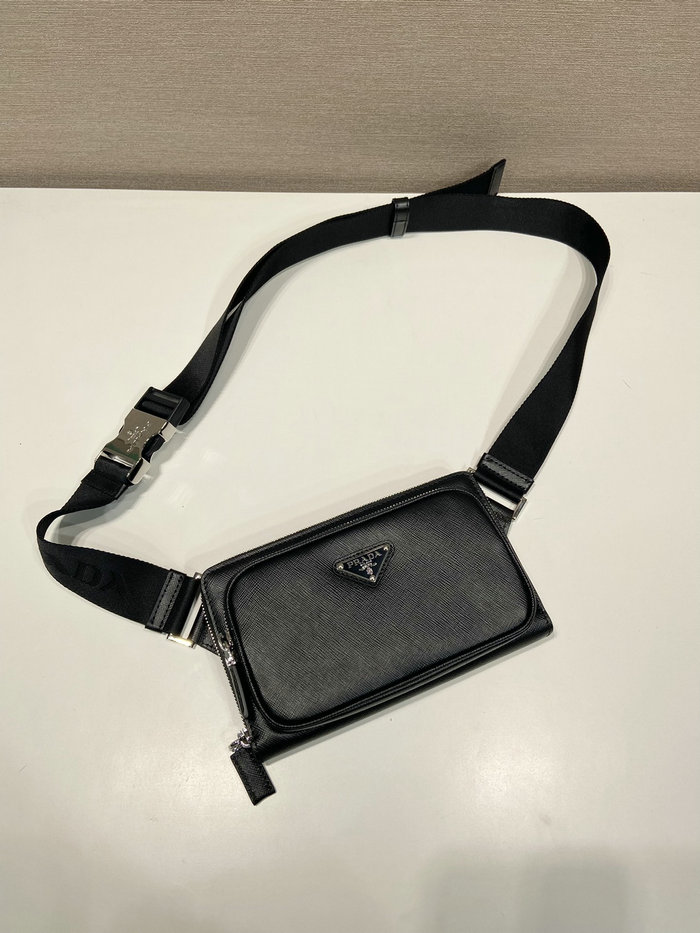 Adjustable woven nylon tape shoulder strap and side-release buckle Enameled metal triangle logo on the front Zipper closure External zipper pocket Small back pocket Card slots inside Leather lining Size: W21 x H13 x D2.5 cm (1" = 2.54cm) It come with serial numbers, card, dust bag and care booklet.