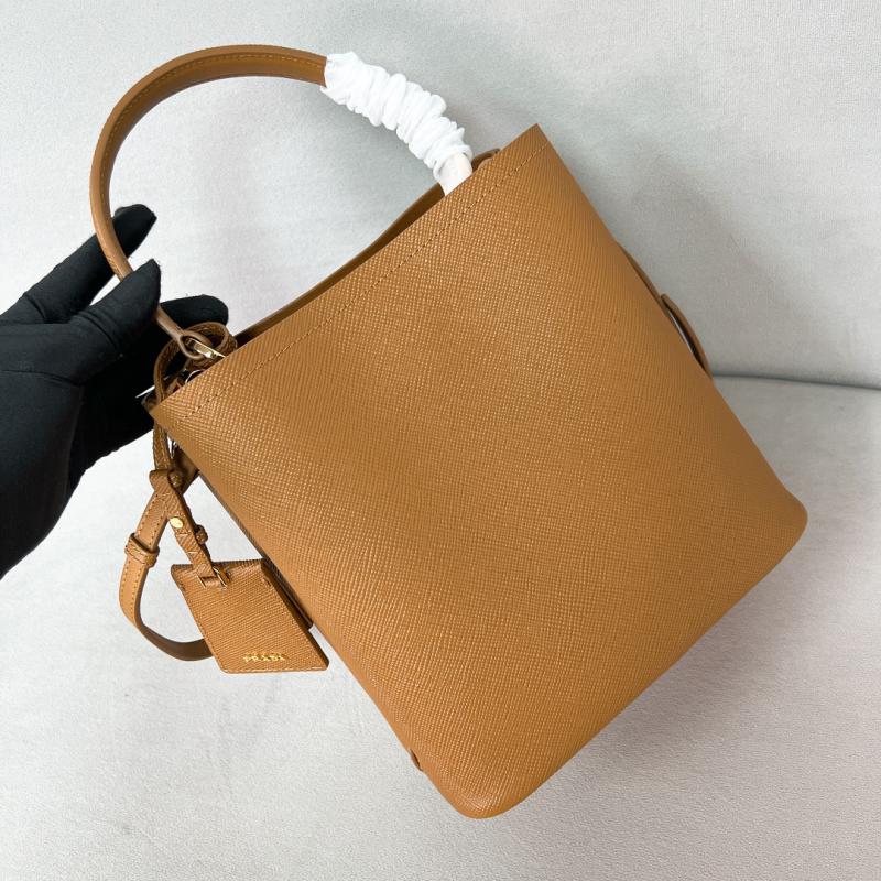 Saffiano leather Leather handle Detachable adjustable leather shoulder strap Detachable leather name tag with metal logo Center pocket with leather-covered magnet closure Triangle logo on Saffiano leather Contrasting nappa leather lining Size: W22 x H23 x D13 cm (1" = 2.54cm) It come with serial numbers, dust bag and care booklet.