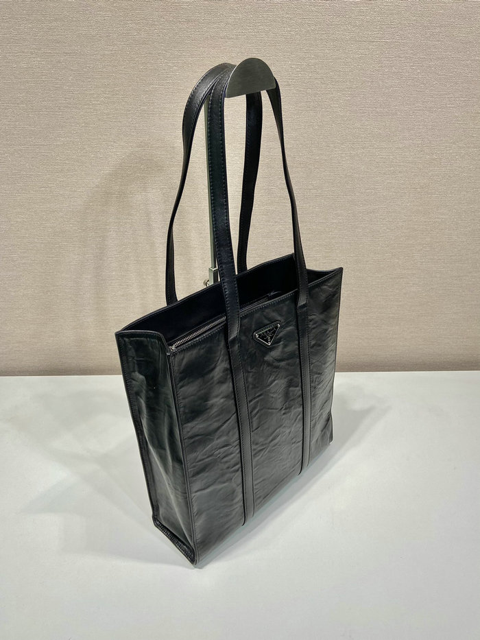 Leather Handmade wrinkled effect Nappa leather handles Metal hardware Enameled metal triangle logo on the front Small Size: W30 x H33 x D8.5 cm Price: $312 Medium Size: W36 x H39 x D13 cm Price: $353 It come with serial numbers, card, dust bag and care booklet.