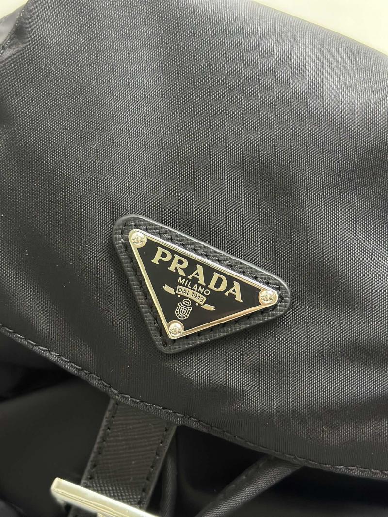 Saffiano details Adjustable woven nylon straps and handle Pockets on the front with flap and side-release buckle Metal hardware Enameled metal triangle logo on the flap Drawstring closure with flap and side-release buckle Re-Nylon logo lining with two pockets, including one with zipper Size: W23.5 x H28 x D12 cm (1" = 2.54cm) It come with serial numbers, dust bag and care booklet.