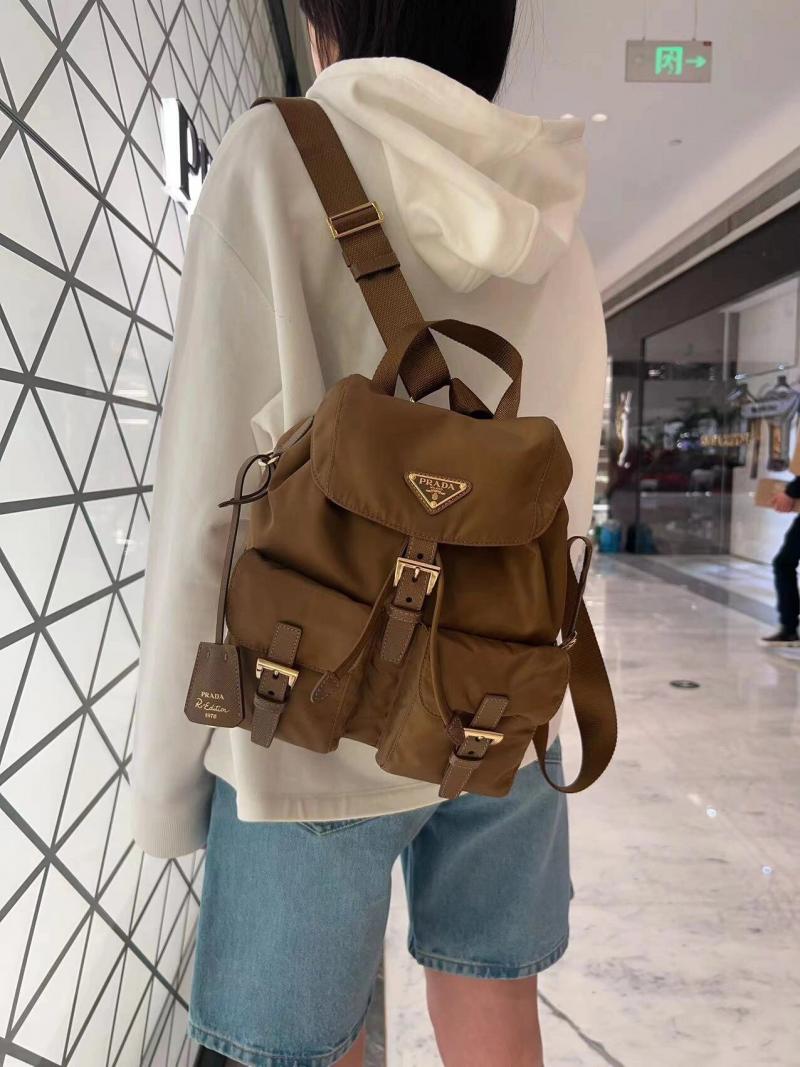 Saffiano details Adjustable woven nylon straps and handle Pockets on the front with flap and side-release buckle Metal hardware Enameled metal triangle logo on the flap Drawstring closure with flap and side-release buckle Re-Nylon logo lining with two pockets, including one with zipper Size: W23.5 x H28 x D12 cm (1" = 2.54cm) It come with serial numbers, dust bag and care booklet.
