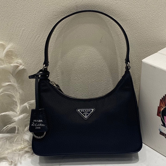 Leather handle with extension for use as a crossbody bag Metal hardware Enameled metal triangle logo on the flap Magnet closure Prada logo nylon... more info